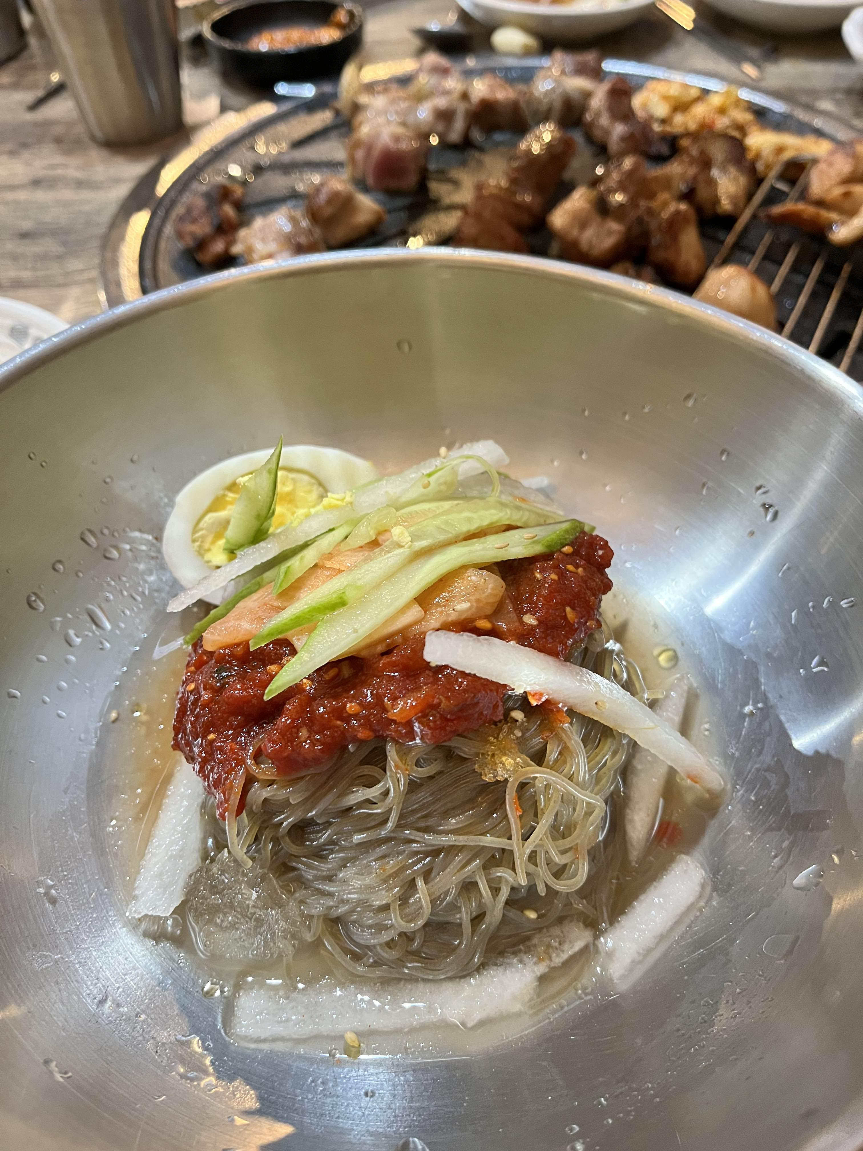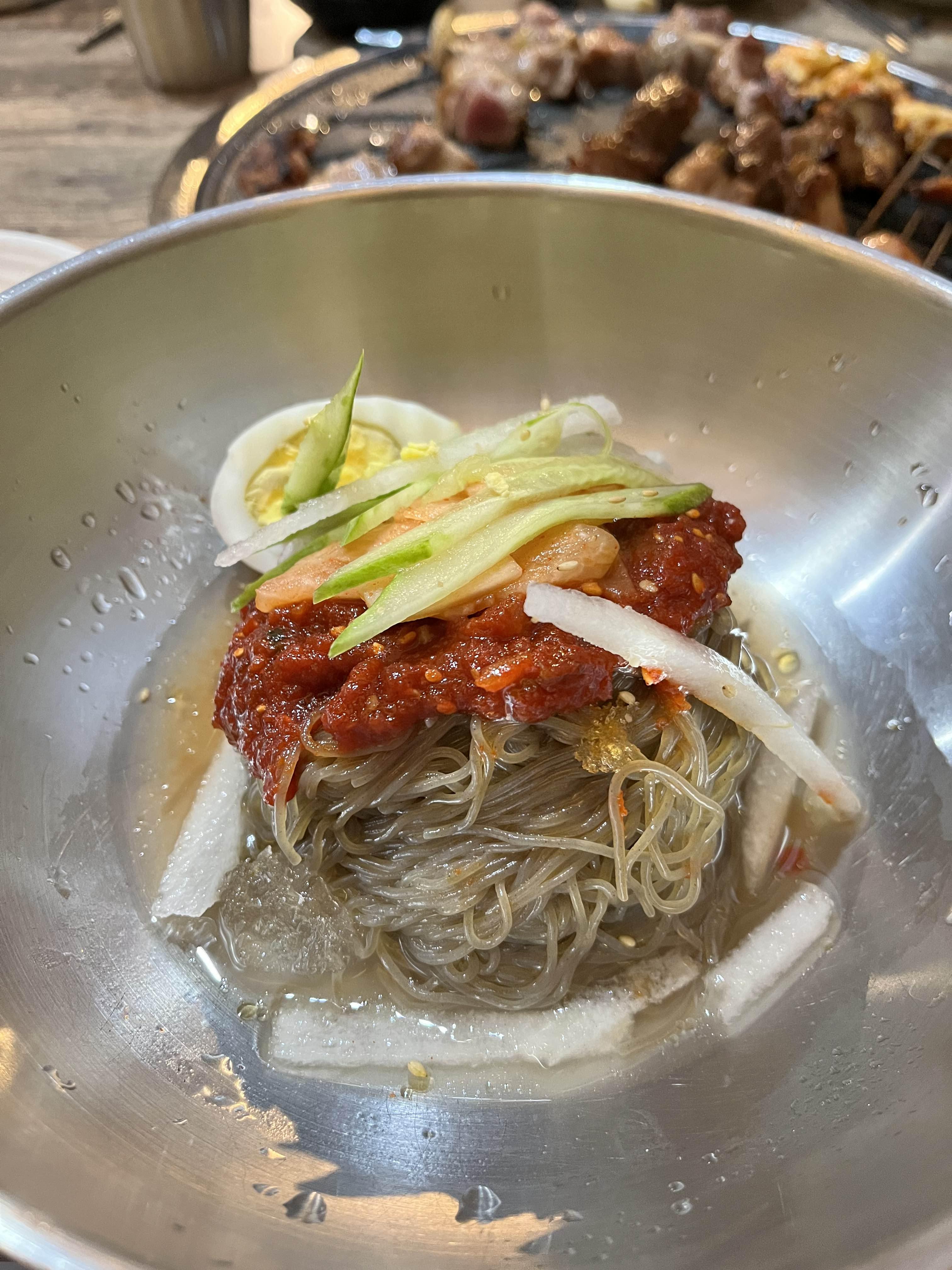 그렇게 고기를 다 먹을 즈음에 우리는 비빔냉면을 주문했다. 근데 냉면이 진짜 왕맛있었다. 사이드 냉면 같은 느낌이 아니라 한 끼 식사 느낌으로 왕 큰 냉면이 나오는데, 그걸 후루룩 후루룩 다 먹었다.